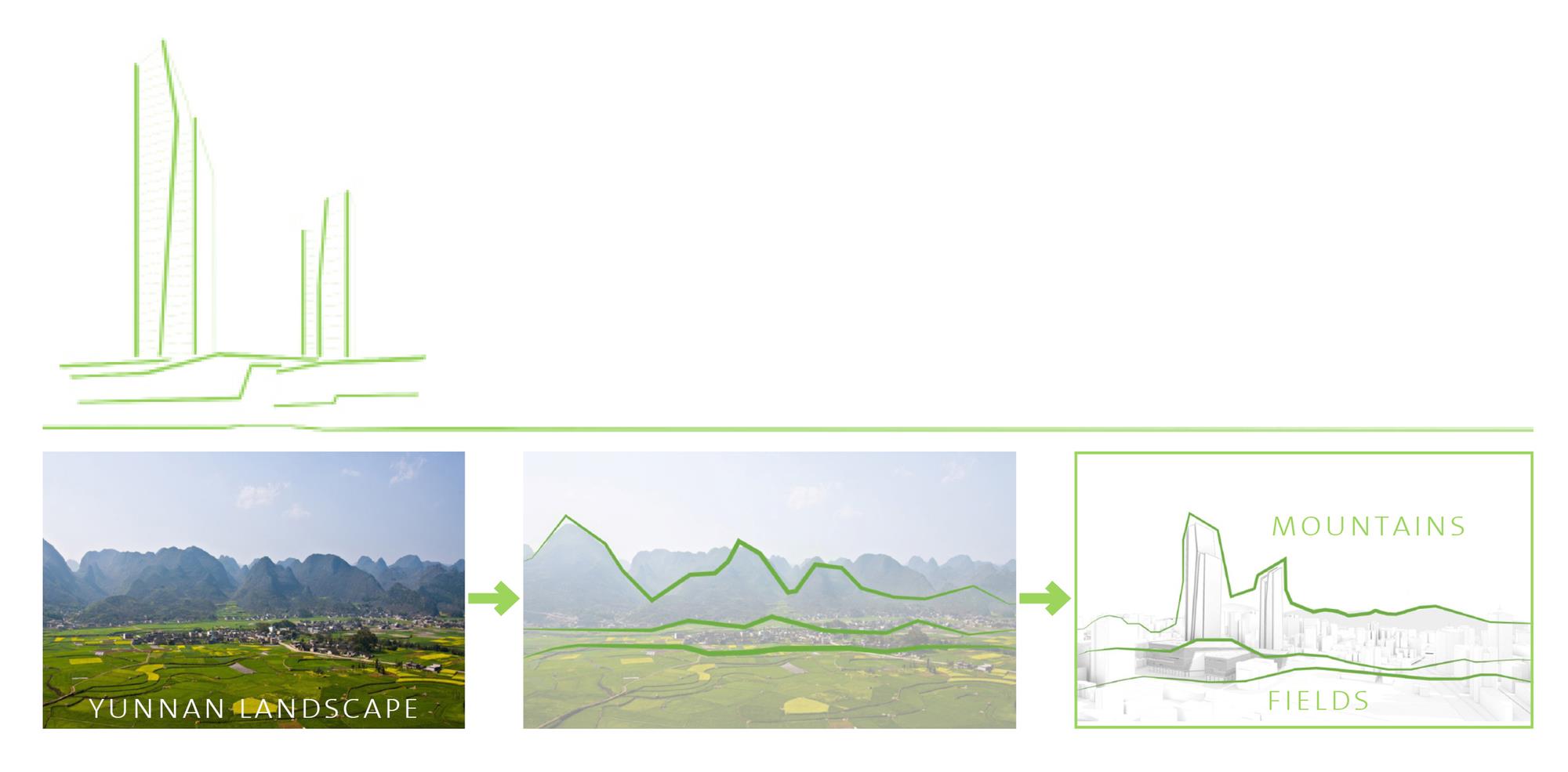 設計靈感。該項目的設計回應了雲南省獨特的景觀及其沿曆史貿易路線的位置。該項目的中心是一條景觀長廊,讓人聯想到該區(qū)地翠綠的山(shān)谷,而周圍起伏的零售裙樓和(hé)一座峭壁狀的塔樓向附近石林的石灰岩地層結構緻敬。該項目各種各樣的功能與多(duō)層露台交織在一起,露台上(shàng)排列着商店(diàn)和(hé)餐館,為(wèi)城市創造了一個(gè)充滿活力的目的地。