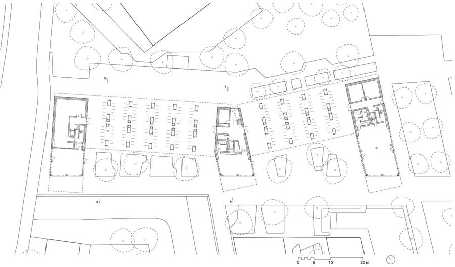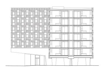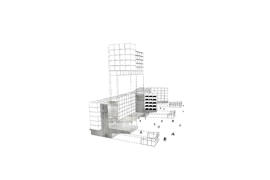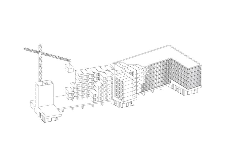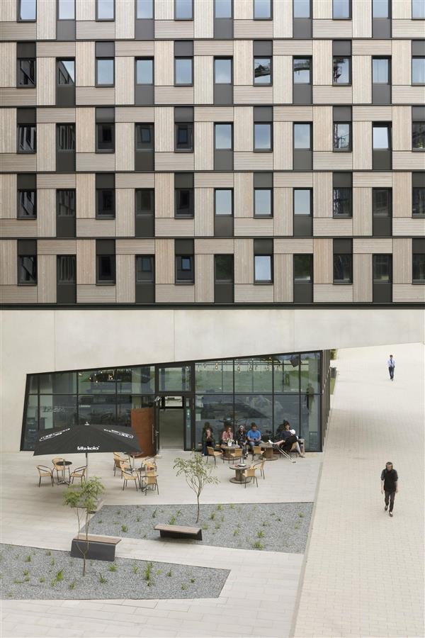 學生(shēng)宿舍的用途和(hé)功能布局在其外觀上(shàng)清晰表達。底層結構和(hé)三個(gè)服務核心筒采用傳統的鋼筋混凝土結構,外加外露混凝土外殼。簡而言之,底層結構是一種混凝土台面,371個(gè)住宅模塊堆疊在上(shàng)面五到六層。在核心筒的懸挑台面下方,有(yǒu)供全民使用和(hé)美食的空(kōng)間(jiān),這些(xiē)空(kōng)間(jiān)具有(yǒu)全高(gāo)玻璃窗。核心區(qū)之間(jiān)的露天底層空(kōng)間(jiān)不僅使建築在城市建築結構中具有(yǒu)滲透性,而且還(hái)為(wèi)約400輛(liàng)自行(xíng)車(chē)提供有(yǒu)頂停車(chē)庫。