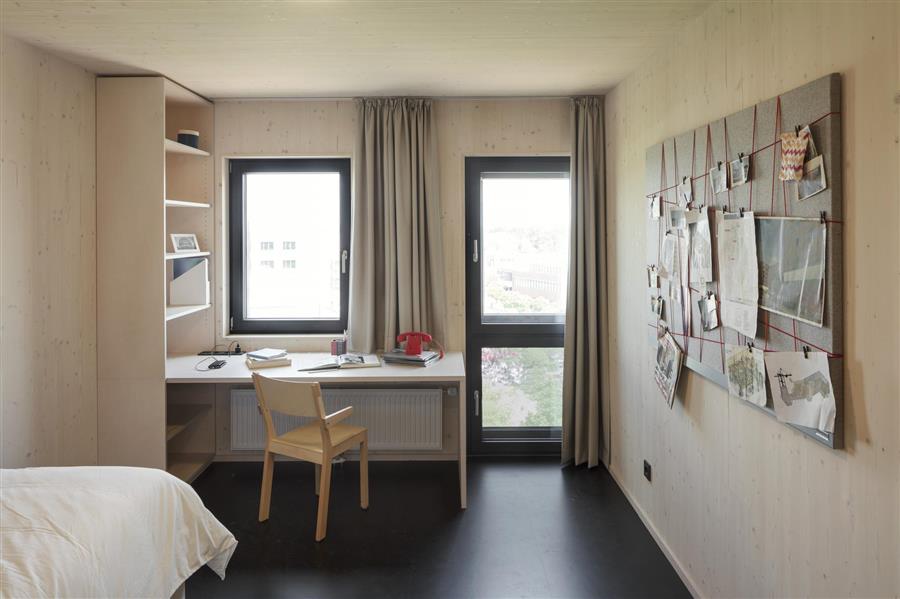 每套公寓的建築面積均為(wèi)20平米,完全由實木(包括其固定裝置)預制(zhì)而成。除了天然橡膠地闆外,每個(gè)表面都留有(yǒu)可(kě)見的木材。這為(wèi)居民創造了舒适和(hé)健康的室內(nèi)氣候。後部通(tōng)風立面覆層由預制(zhì)面闆中的灰色落葉松木材制(zhì)成。